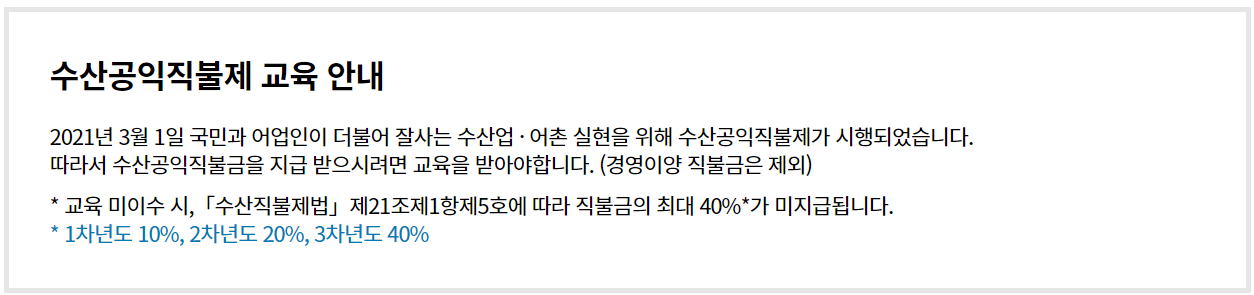 ✔️수산공익직불금 신청 후 직불금을 지급받기 위해서는 교육을 이수해야 합니다.