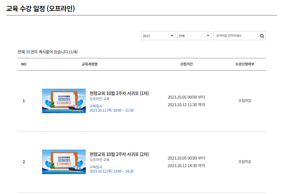 ✔️ 수산공익직불제 오프라인(현장) 수강은 온라인 수강을 할 수 없는 경우를 위해 지역별로 교육 일정을 확인할 수 있습니다.