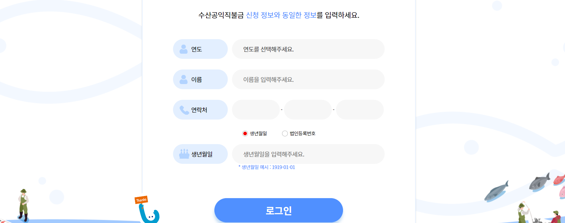 🔴주의🔴 수산공익직불금 신청 시 기재한 정보와 동일하게 입력하셔야 합니다.