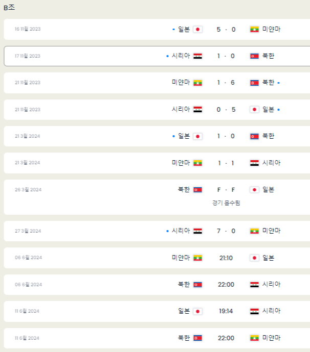 B조 북한은 일본과 평양에서 경기 예정이었지만 돌연 경기를 취소해 몰수패를 당하고, 일본에게 0-3 몰수승을 내주었습니다.(관련 뉴스 이동)
