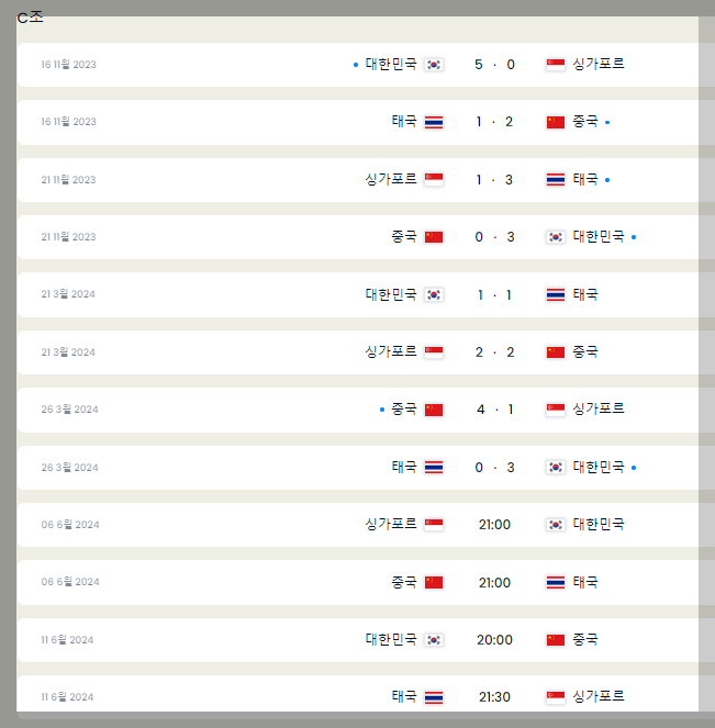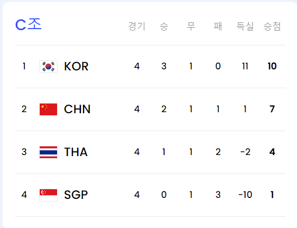 현재 대한민국은 C조 1위(경기 결과 확인하기)이며, 싱가포르와 중국과 2차전을 앞두고 있습니다.
