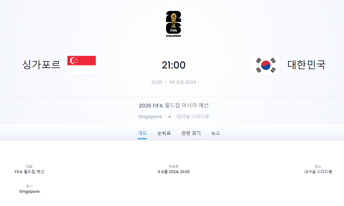 • 경기 일정: 6월 6일 21시